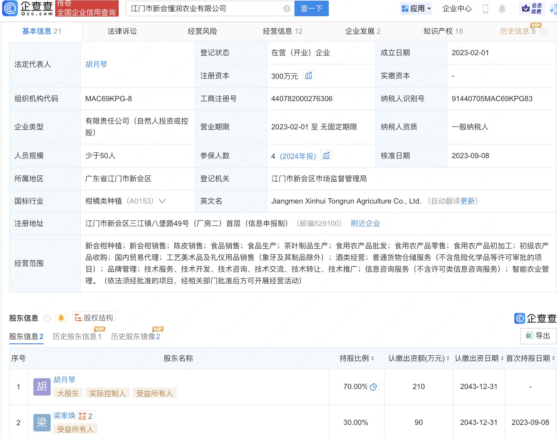 近日,据央视报道,接到群众举报,反映陈皮市场存在年份虚标、产地及工艺造假等问题,关联公司涉及江门市新会懂润农业有限公司、江门市新会区古道柑普茶业有限公司。涉事公司江门市新会区古道柑普茶业有限公司成立于2017年,经营范围含茶叶制品生产、陈皮销售等,由颜财源全资持股。此外,涉事公司江门市新会懂润农业有限公司成立于2023年,经营范围含新会柑种植、新会柑销售、陈皮销售等,由胡月琴、梁家焕共同持股。