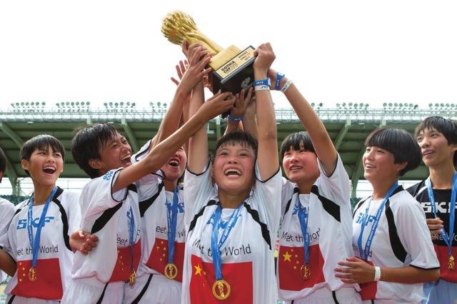 琼中女足荣获2015年“哥德堡杯”世界青少年足球锦标赛冠军,赛后姑娘们激动地举起了奖杯。