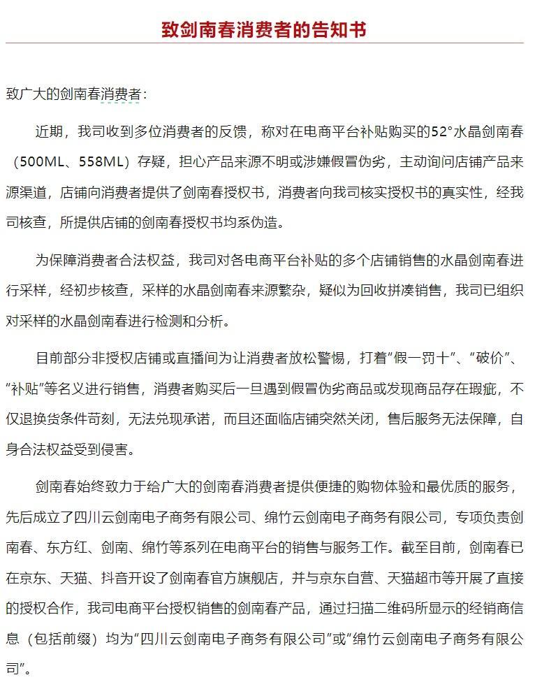 无独有偶,剑南春也在2024年双十一前夕针对电商“补贴”发声,公司于去年10月18日发表《致消费者告知书》表示,目前存在电商平台店铺的剑南春授权书是伪造的现象,经核查,采样的水晶剑南春来源繁杂,疑似回收拼凑销售,公司已组织对采样的水晶剑南春进行检测和分析。
