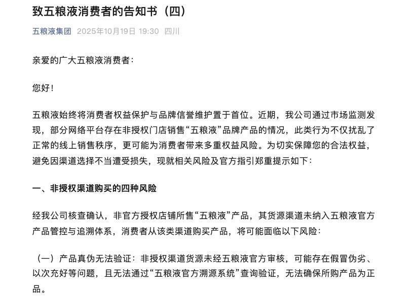 10月19日晚间,五粮液集团发布《致五粮液消费者的告知书(四)》,五粮液表示:通过市场监测发现,部分网络平台存在非授权门店销售“五粮液”品牌产品的情况。同时,五粮液点名某电商平台上的1919酒类直供、歪马送酒、某电商平台百亿补贴官方渠道等46家门店列入“非授权店铺名单”。
