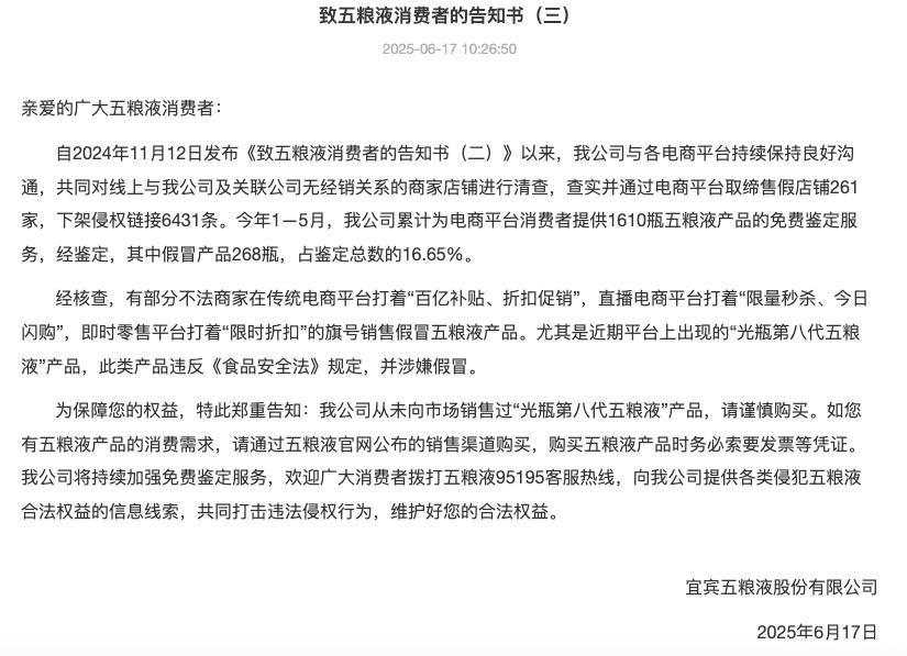 今年6.18前夕,即6月17日,五粮液在官网发布《致消费者的告知书(三)》称:今年1—5月,公司累计为电商平台消费者提供1610瓶五粮液产品的免费鉴定服务,经鉴定,其中假冒产品268瓶,占鉴定总数的16.65%。